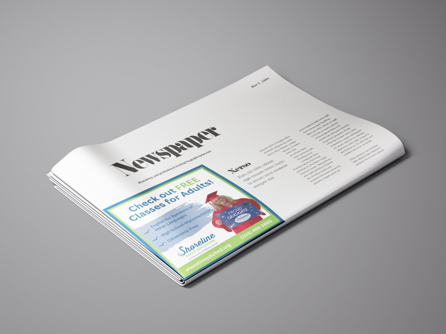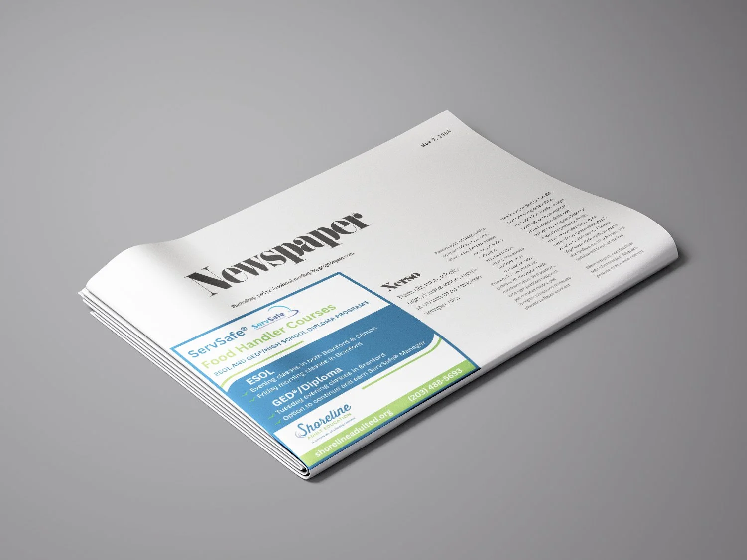I design targeted newspaper advertisements for Shoreline Adult Education to expand community awareness and drive seasonal enrollment. Working within publication specifications. I craft high-contrast, space-efficient layouts that cut through dense editorial environments. The ads translate program offerings into clear and compelling messaging.