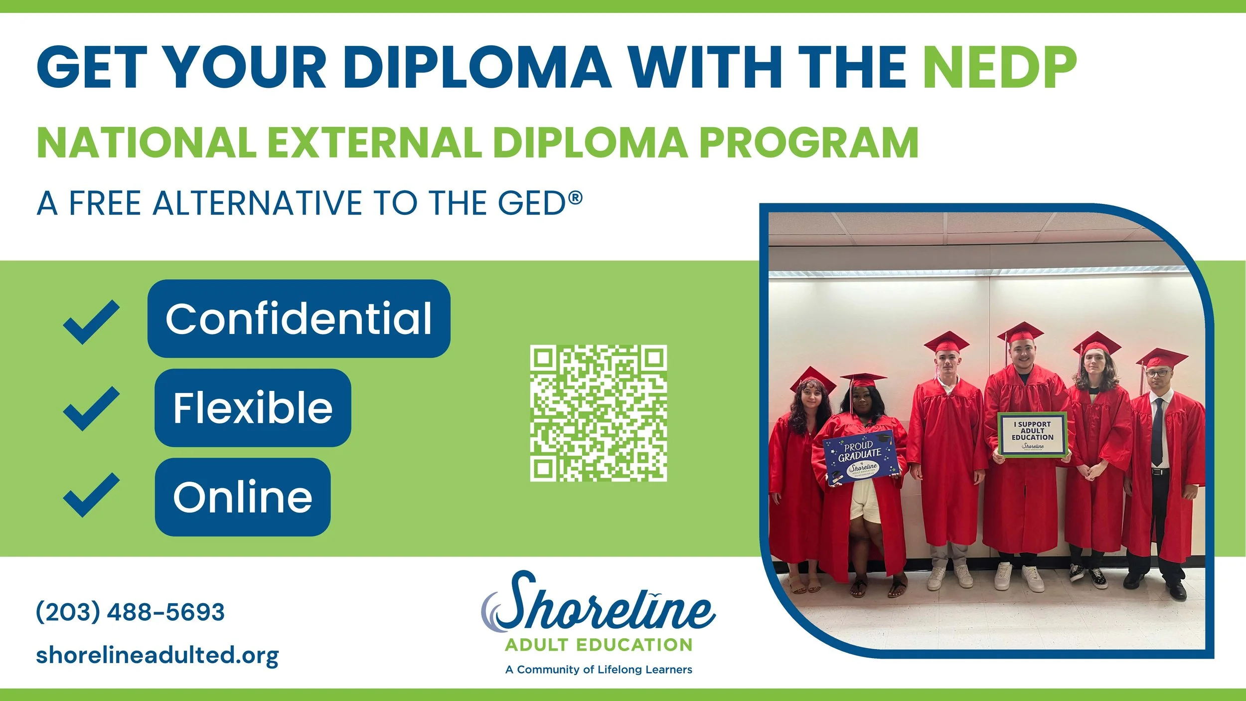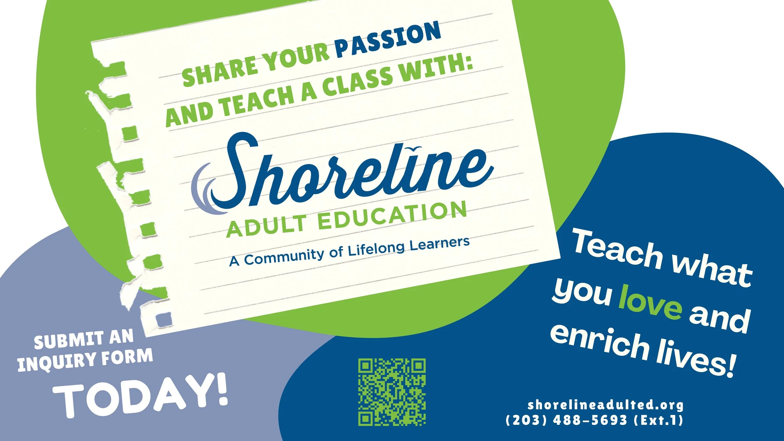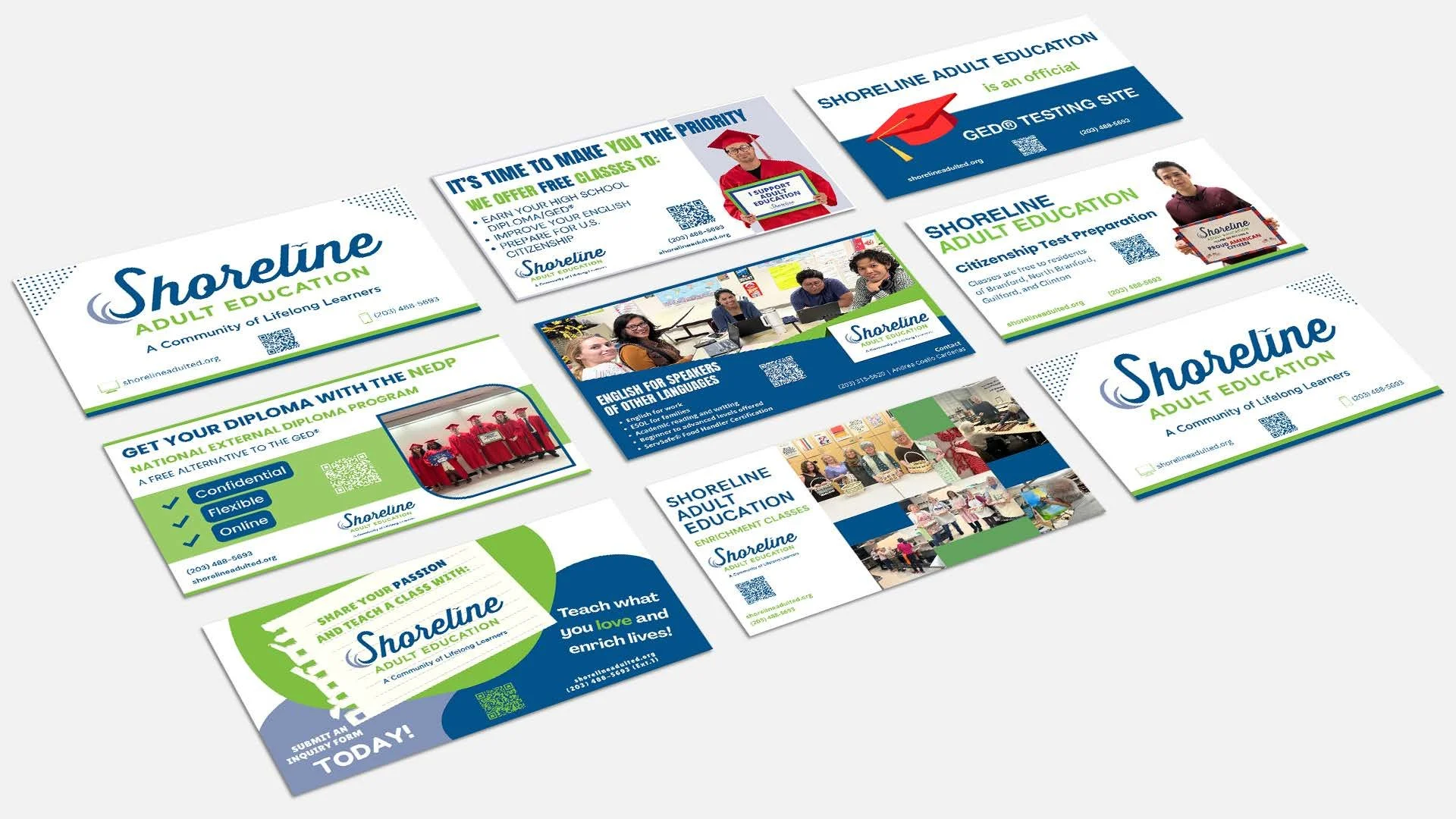 To increase on-site visibility, I created a dynamic digital presentation displayed on all school monitors for Shoreline Adult Education at Branford High School. Built with strong hierarchy, high-contrast layouts, and screen-optimized graphics, the content is designed to communicate clearly from a distance and within short viewing windows, turning everyday foot traffic into an ongoing engagement opportunity.